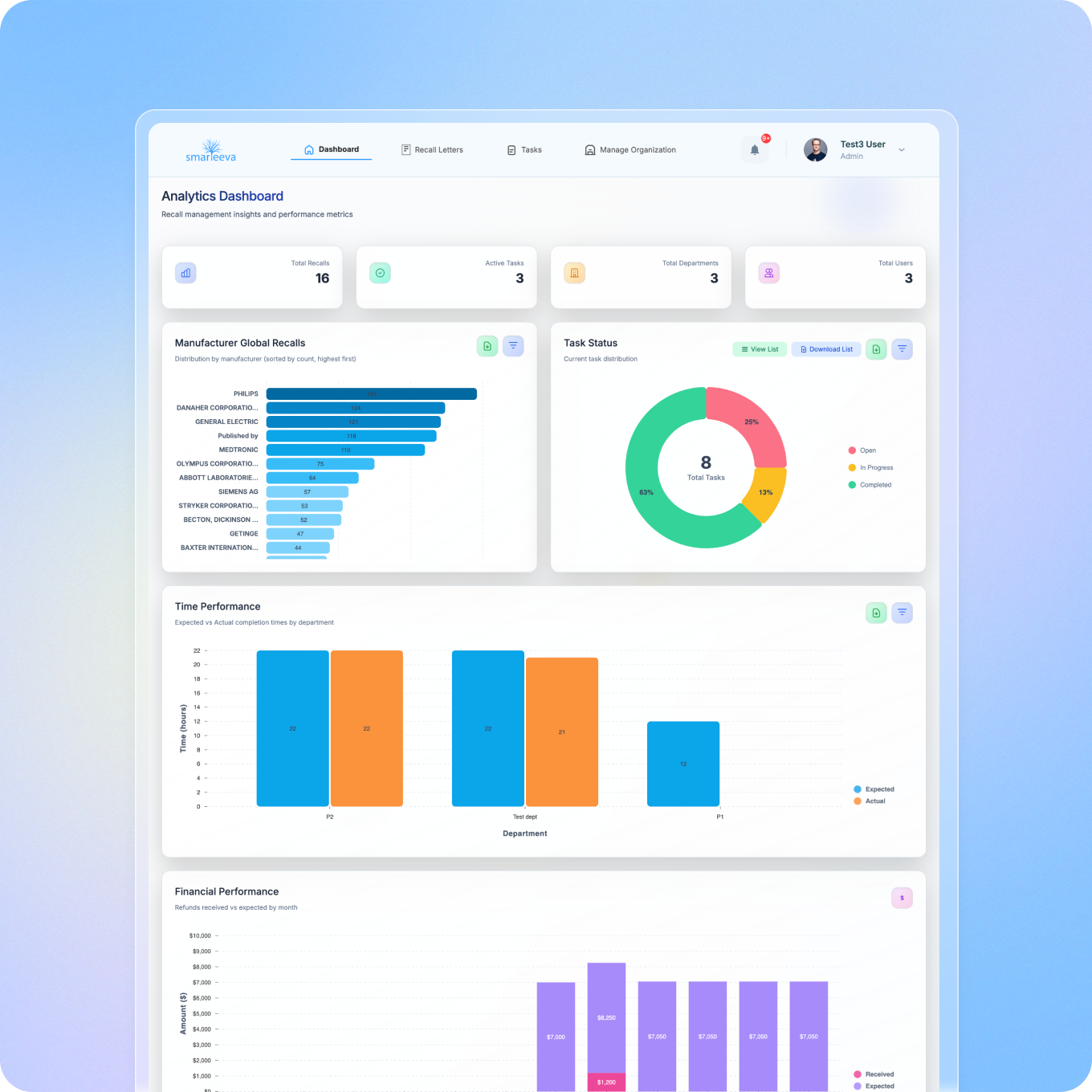 A two-sided portal connecting medical device manufacturers with the hospitals and health systems affected by their recalls. Manufacturers issue recall notifications through one dashboard. Health systems receive alerts, acknowledge receipt with one click, and track required actions, no email chains, no lost PDFs, no manual follow-up spreadsheets.